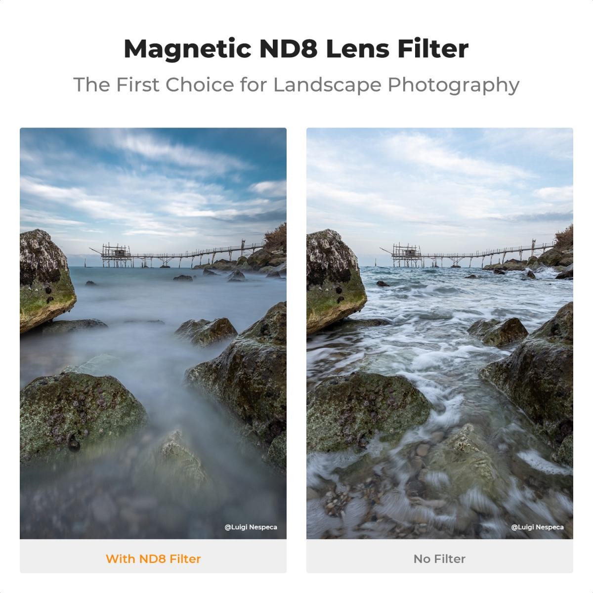 K&F 72 mm NANO-X-ND8 magnetski filter omogućuje brzu instalaciju od jedne sekunde s profesionalnom jasnoćom. Sa 16-slojnim zelenim nano-premazom smanjuje refleksije, blokira UV zrake i održava točne, prirodne boje bez ikakvog efekta odmjesa. Vodootporan je, otporan na ogrebotine i jednostavan za čišćenje, te štiti vaš objektiv, a istovremeno pruža performanse visoke razlučivosti. Uključuje i magnetsku i navojnu opciju montaže za maksimalnu svestranost.