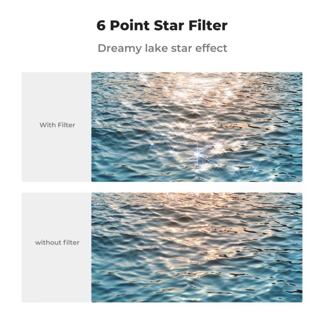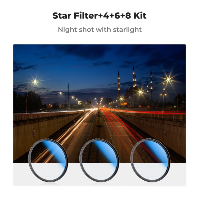 K&F 82mm Star Filters 3pcs Set uključuje 4, 6 i 8-točaka cross screen filtere, dizajnirane za dodavanje jedinstvenih efekata zvjezdanog praska na vaše fotografije uz visoku jasnoću i minimalnu refleksiju.
