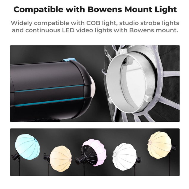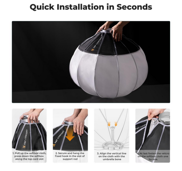 K&F 85CM lanterna Soft Light Box dizajnirana je za fotografe i filmaše koji trebaju svestrana i učinkovita rješenja osvjetljenja. Njegov sferni dizajn osigurava meko svjetlo u svim smjerovima od 360°, što ga čini savršenim za studijsku upotrebu ravnomjernim širenjem svjetla s kutom snopa od 270°. Ova softbox lampa idealna je za stvaranje meke, ravnomjerne rasvjete na širokom području s jednim izvorom svjetlosti.