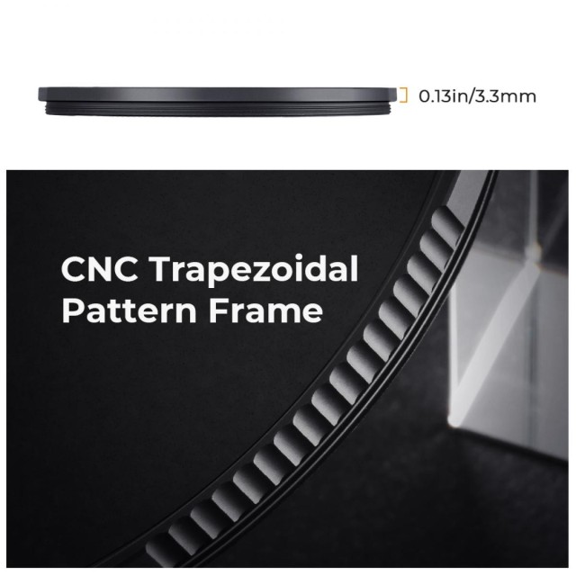 Ultra-tanak dizajn okvira, koji mjeri samo 3,3 mm, sprječava bilo kakvo vinjetiranje ili tamne kutove, što je osobito važno pri korištenju širokokutnih ili teleobjektiva. Dizajn neklizajućeg okvira izrađen na CNC-u čini filtar lakim za pričvršćivanje i uklanjanje, dodajući praktičnost njegovim funkcionalnim prednostima.