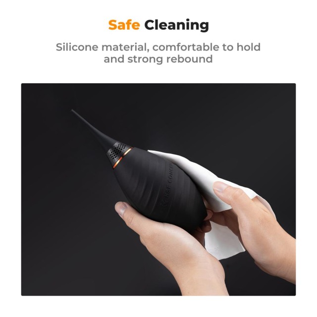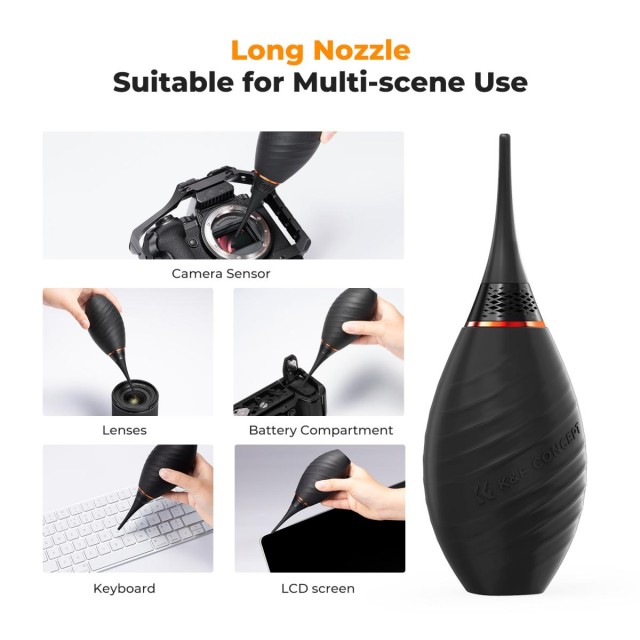 Dvosmjerni ventil za kontrolu zraka učinkovito sprječava usisavanje prašine i uzrokuje sekundarno onečišćenje te pojednostavljuje unutarnji prostor puhanja zraka, poboljšavajući brtvljenje opreme. Duga mlaznica je prikladnija za čišćenje dubljih područja poput DSLR senzora i odjeljaka za baterije fotoaparata.