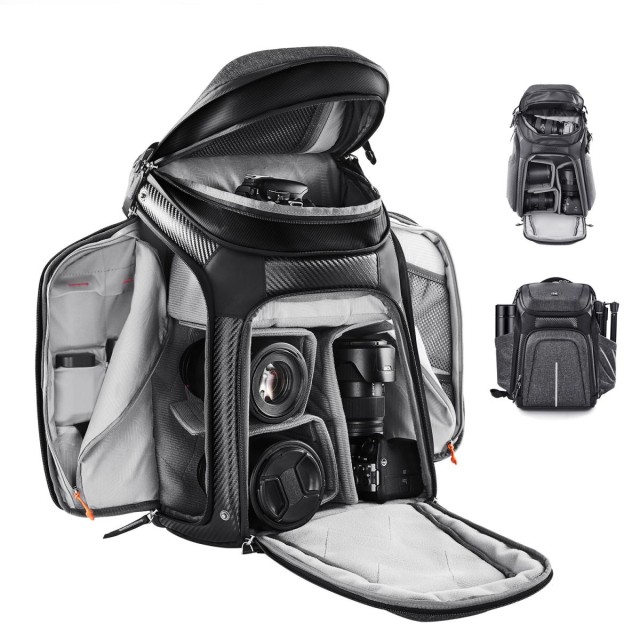 Ruksak za fotoaparat velikog kapaciteta. Kako bi zadovoljio potrebe fotografa za putovanja i svakodnevnu upotrebu, K&F Concept dizajnirao je ovaj profesionalni ruksak za fotoaparat velikog kapaciteta i može primiti 2 fotoaparata + 4 objektiva + prijenosno računalo od 15,6" (odvojeni džep) + tablet od 12,9" (odvojeni džep) + tronožac i ostalo opremu za fotoaparat ili osobne stvari. Veličina: 44 * 29 * 24 cm. Gornji pretinac može držati bitne stvari za putovanje poput odjeće, ručnika ili drugih osobnih predmeta.