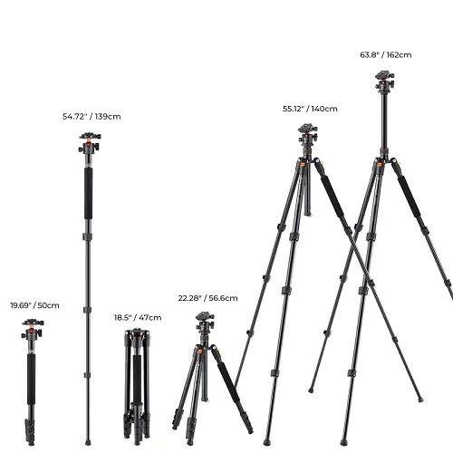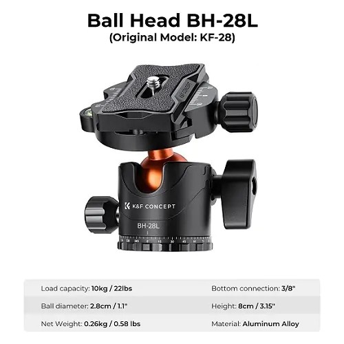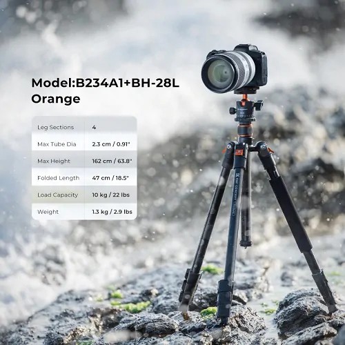K&F Concept B234A1+BH-28L DSLR stativ je nadograđeni model temeljen na najprodavanijoj seriji TM2324 tvrtke K&F Concept, usavršavanoj tijekom sedam godina radi poboljšanih performansi i pouzdanosti. Izrađen od visokokvalitetne vojne magnezijske aluminijske legure, pruža snažnu, ali laganu konstrukciju pogodnu za redovitu vanjsku upotrebu i putovanja. Metalna kuglasta glava od 28 mm podržava do 10 kg i ima dizajn bez prigušenja ulja za glatko i precizno kretanje, zajedno s panoramskom skalom od 360° za precizno panoramsko snimanje. Jedna noga stativa može se odvojiti i pretvoriti u lagani monopod ili štap za hodanje, nudeći dodatnu fleksibilnost za dinamična okruženja snimanja. Brzo zaključavanje nogu omogućuje brzo rukovanje jednom rukom, omogućujući brzo postavljanje i rastavljanje. S podesivim kutovima nogu, gumbom za podešavanje kuta cijevi podnožja s oprugom koji se sam zaključava i niskom minimalnom visinom, stativ je posebno koristan za makro i specijalnu fotografiju. Gumene nožice poboljšavaju stabilnost na raznim površinama, dok integrirana libela osigurava precizno poravnanje. Kompaktan, svestran i jednostavan za transport, ovaj stativ izvrstan je pratitelj za putovanja, pejzažnu, portretnu i makro fotografiju.