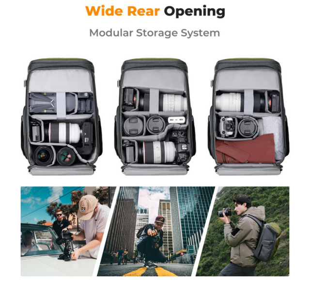 K&F ruksak 25L Nature Wander 01 (zeleni) dizajniran je za fotografe koji trebaju svestranost, stabilnost i jednostavan pristup dok su u pokretu. S jedinstvenim dizajnom Magic Bin, torba vam omogućuje podešavanje omjera unutarnjeg prostora između 5:5 i 2:8 jednostavnim guranjem prema gore ili dolje, prilagođavajući se vašim specifičnim potrebama za pohranu opreme. To ga čini idealnim za fotografiju na otvorenom, urbanu uličnu fotografiju, portrete na otvorenom i VIOG fotografiju.
