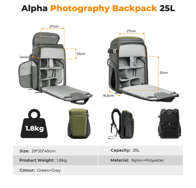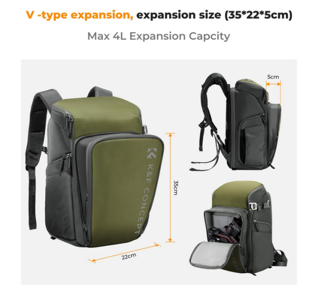 K&F ruksak 25L Nature Wander 01 (zeleni) svestrani je fotografski ruksak s dizajnom Magic Bin za prilagodljiv prostor, nudi gornji i bočni pristup, proširivi kapacitet i dodatnu stabilnost vaše opreme. Savršen je za vanjsku, uličnu i portretnu fotografiju, s namjenskim pretincem za prijenosno računalo od 16 inča.