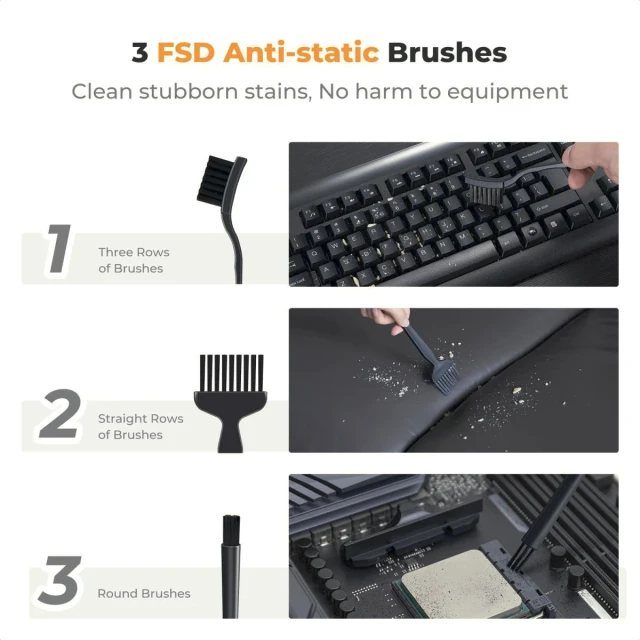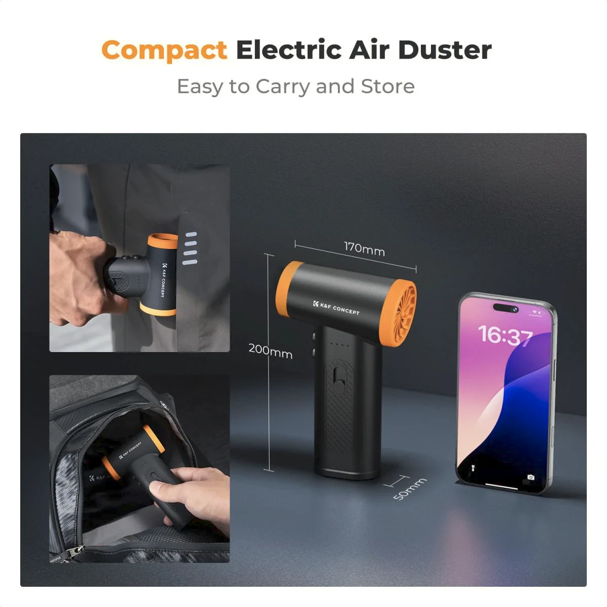 K&F Concept 12-u-1 komprimirani zračni čistač bez četkica snažan je, ekološki prihvatljiv alat za čišćenje dizajniran za sigurno i učinkovito uklanjanje prašine s fotoaparata, objektiva, senzora, elektronike, tipkovnica i druge osjetljive opreme. S izdržljivim motorom bez četkica, višestrukim mlaznicama i dizajnom za višekratnu upotrebu, zamjenjuje jednokratne spremnike zraka za dugotrajno i pouzdano održavanje.