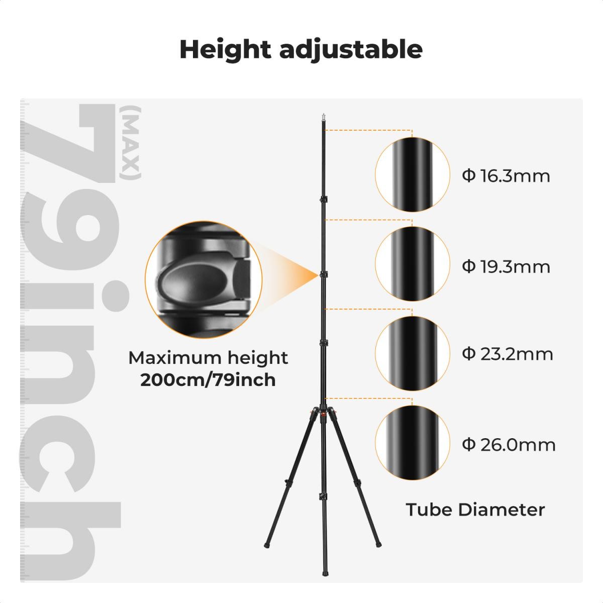 Zahvaljujući središnjem stupu od četiri dijela i nogama od dva dijela, visina stativa može se podesiti od 53 cm do 2 m. Pogodan je za snimke iz niskog i visokog kuta.