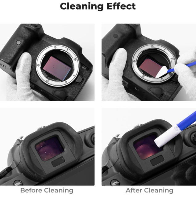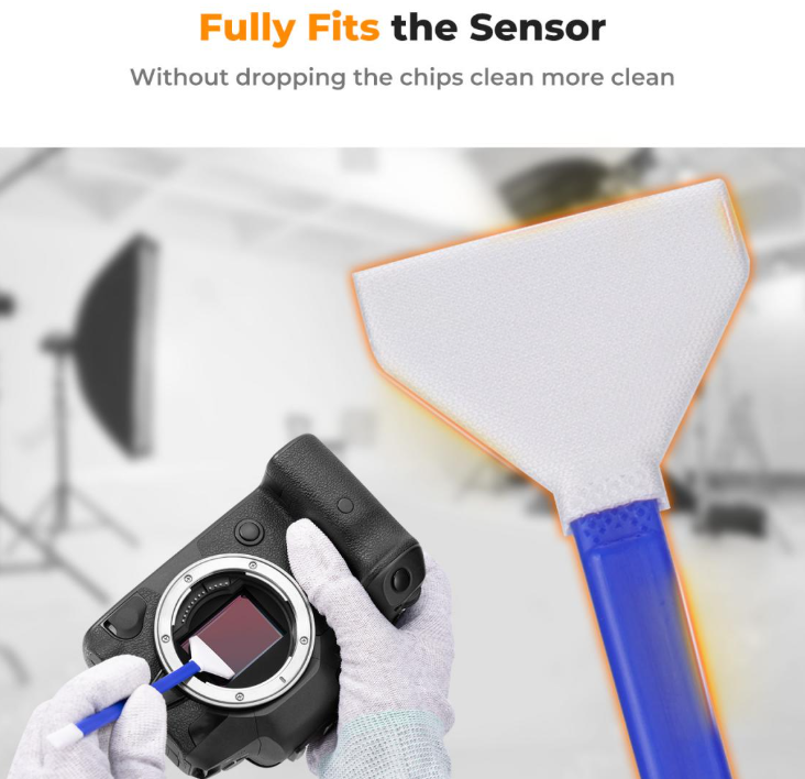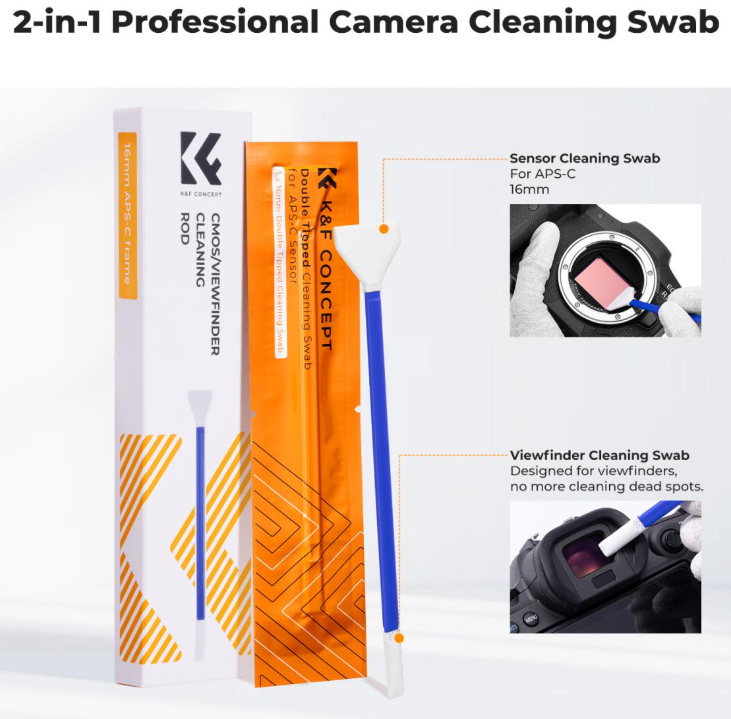 K&F Concept 2-u-1 je komplet za čišćenje APS-C senzora i tražila od 16 mm, a sadrži dvonamjenske štapiće s preciznim dvoslojnim superfinim mikrovlaknima (debljine 270 g, 288% mekši) za čišćenje APS-C senzora, tražila, leća i optike bez tragova. Izrađeni s 18M filtracijom čiste vode i vakuumski zatvorenim pakiranjem, ergonomske ABS ručke osiguravaju primjenu bez prašine i bez oštećenja za Nikon, Sony i Canon DSLR/SLR fotoaparate.