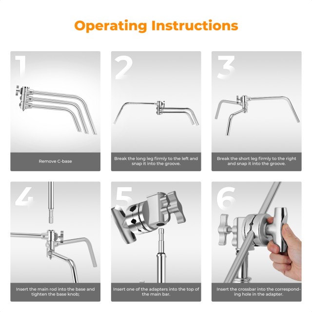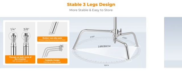 Krajevi poprečnih šipki imaju navoje od 1/4" i 3/8" , nudeći kompatibilnost sa širokim rasponom uređaja. Uključeni adapteri omogućuju prilagodbu šipki različitih promjera, povećavajući svestranost. Sklopiva baza u obliku slova C s jastučićima protiv klizanja pruža izvrsnu stabilnost i kompaktno skladištenje. Dodatne vreće s pijeskom mogu se koristiti za dodatnu postojanost tijekom zahtjevnih postavki.