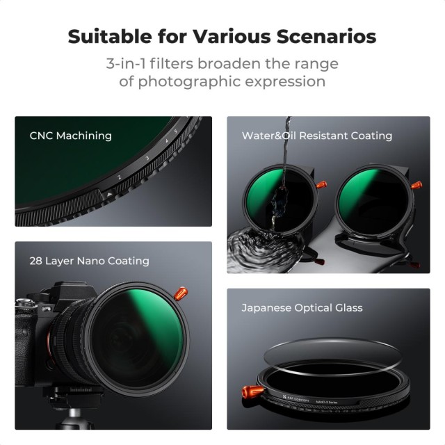 3 u 1 filter - 43 mm varijabilni ND2-32 (1-5 stopa) i kružni polarizacijski filter CPL i crna magla 1/4 3 u 1 HD filter za objektive s 28 višeslojnih premaza za objektive fotoaparata serije Nano-Xcel. Jedan filter podržava smanjenje svjetla, stvara sanjiv efekt i poboljšava boju i kontrast slike, široko odgovara većini fotografskih potreba, pruža više kreacija za vašu sliku.