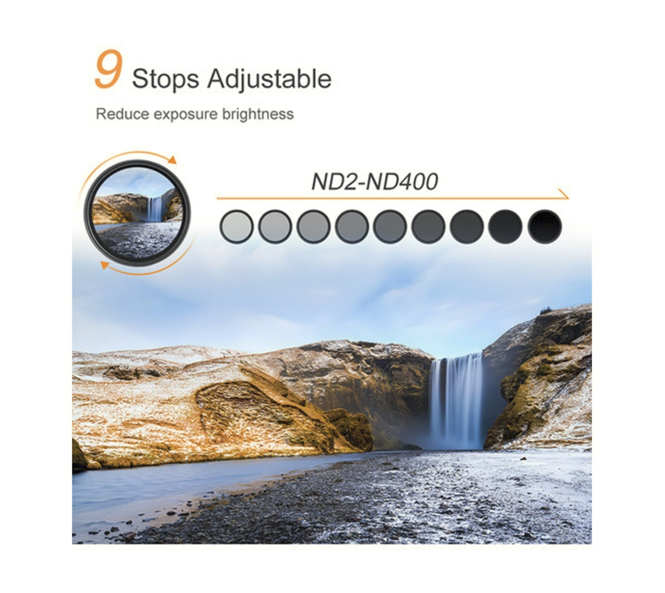 K&F Concept 52mm True Color Variable ND2–ND400 filter omogućuje glatku i preciznu kontrolu ekspozicije od 1 do 9 koraka, a istovremeno održava prirodne i točne boje. Dizajniran s vrhunskim japanskim optičkim staklom i višeslojnim nano premazima, pruža oštre, visokokvalitetne slike za duge ekspozicije, filmske videozapise i snimanje pri jakom svjetlu.