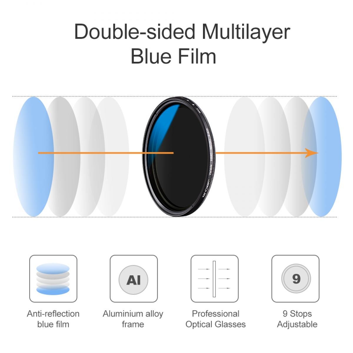 Izrađen od vrhunskog optičkog stakla, filter pruža izvrsnu jasnoću i minimizira optička izobličenja. Rotiranje prednjeg elementa omogućuje glatke prijelaze između ND razina, zamjenjujući više fiksnih ND filtera i pružajući neusporedivu fleksibilnost pri snimanju na otvorenom. Ultra tanki aluminijski okvir pomaže u sprječavanju vinjetiranja, čak i na širokokutnim objektivima, dok njegova izdržljiva konstrukcija osigurava dugotrajnu pouzdanost. Idealan za pejzažnu fotografiju, portrete s malom dubinom polja, efekte zamućenja pokreta, snimanje videa pri jakom dnevnom svjetlu i kreativni rad sa sporim zatvaračem, ovaj VND filter je neophodan alat za postizanje dosljedne ekspozicije i umjetničke kontrole.