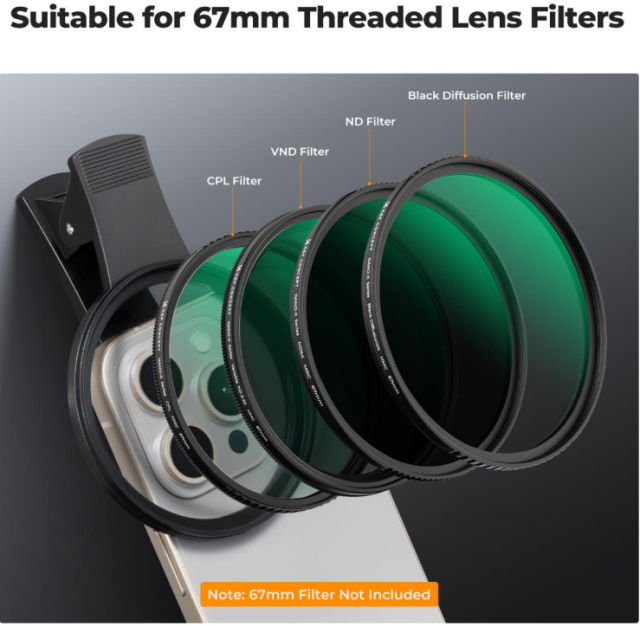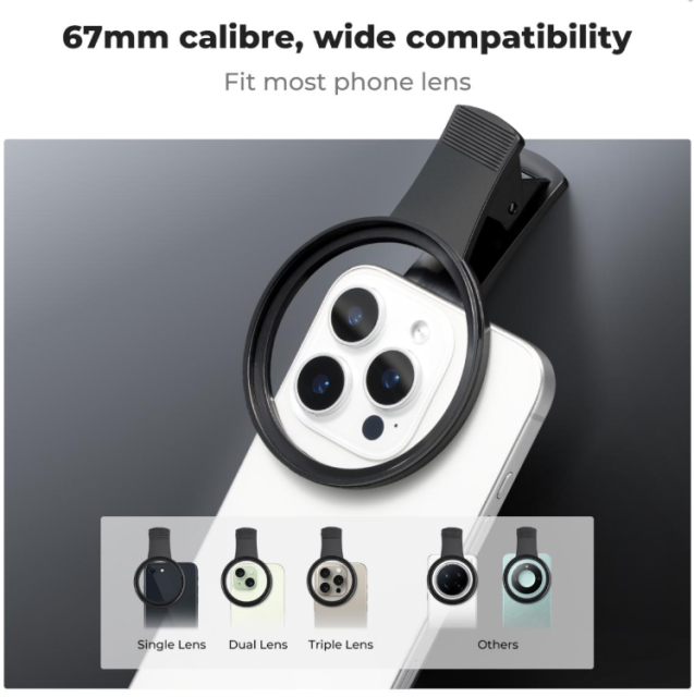 K&F Concept 67mm univerzalna vijčana stezaljka za filter za mobitel lagani je adapter s kopčom koji pretvara bilo koji pametni telefon u profesionalni fotografski alat, s navojem od 67 mm za besprijekornu kompatibilnost sa standardnim filterima i širokom podrškom za iPhone, Samsung i druge modele. S instalacijom bez alata za manje od sekunde, kompaktnim dizajnom za jednostavnu prenosivost i robusnom strukturom za stabilne snimke, ova stezaljka otključava kreativne efekte filtera poput CPL-a ili ND izravno na vašem mobilnom fotoaparatu, idealno za snimanje videa u pokretu, selfije ili snimke pejzaža.