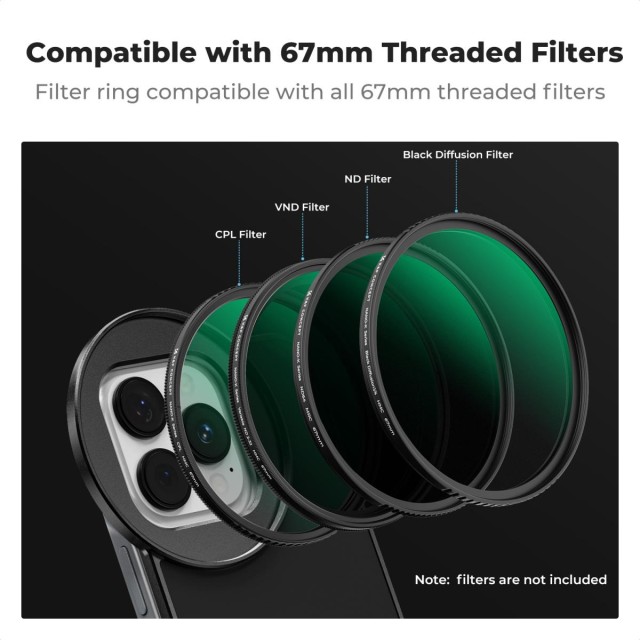 Pretvorite svoj iPhone u profesionalni fotoaparat uz K&F Concept 6,1-inčni magnetski adapter za filter objektiva, elegantni, inovativni dodatak koji spaja mobilnu praktičnost s filtracijom na razini DSLR-a za zapanjujuće, kreativne snimke u pokretu. Precizno konstruiran za modele iPhone 16, 16 Pro, 15, 15 Pro, 14, 14 Pro, 13, 13 Pro i 12/12 Pro, ovaj nosač magnetski se pričvršćuje oko perimetra stražnjeg objektiva vašeg telefona bez vinjetiranja ili blokiranja ultraširokokutnih, širokokutnih ili telefoto senzora, otključavajući puni potencijal 67-milimetarskih navojnih filtera poput kružnih polarizatora (CPL) za smanjenje odsjaja, neutralne gustoće (ND) za duge ekspozicije, UV zaštite, crne difuzije za filmsku mekoću, zvjezdanih filtera za dramatične efekte i još mnogo toga - iako imajte na umu da nije kompatibilan s magnetskim filterima i nijedan nije uključen. Dvostrani magnetski sustav proširuje vaš kreativni arsenal: pričvrstite nosač na telefon s jedne strane, a kompatibilnu dodatnu opremu poput dodatnih magnetskih prstenova, LED svjetala ili sjenila objektiva s druge strane za višeslojne postavke, osiguravajući da sve ostane na mjestu čak i tijekom dinamičnog snimanja iz ruke ili planinarenja. Disciplina svjetla je besprijekorna s bešavnim brtvljenjem rubova koje eliminira curenje za čiste slike bez artefakata, a nadopunjeno je protukliznim jastučićima u obliku slova L koji pružaju čvrsto i stabilno prianjanje na bilo kojoj površini. Omotan vrhunskim tekućim silikonskim premazom s obje strane, otporan je na otiske prstiju za čist, profesionalan izgled i nudi mekan, udoban dodir koji neće ogrebati vaš uređaj. Kompaktan, lagan i jednostavan za instalaciju ili uklanjanje, ovaj adapter je neophodan za mobilne fotografe, vlogere i influencere koji traže poboljšanu kontrolu nad ekspozicijom, bojom i efektima bez glomaznih platformi.