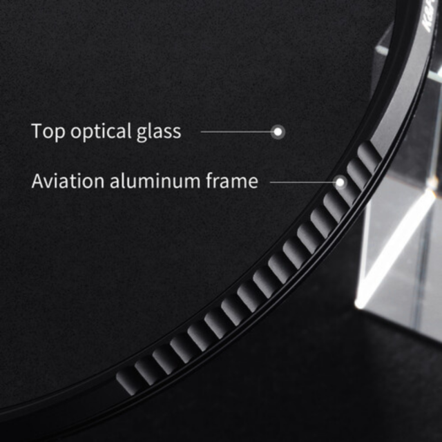 Filtar je izrađen od izdržljivog aluminija i ima tanak dizajn tako da neće smetati širokokutnim lećama. Ima višeslojni premaz koji istovremeno osigurava prozirnost i otpornost na ogrebotine. Osim toga, ima ureze sa strane za lakše uklanjanje i pričvršćivanje.