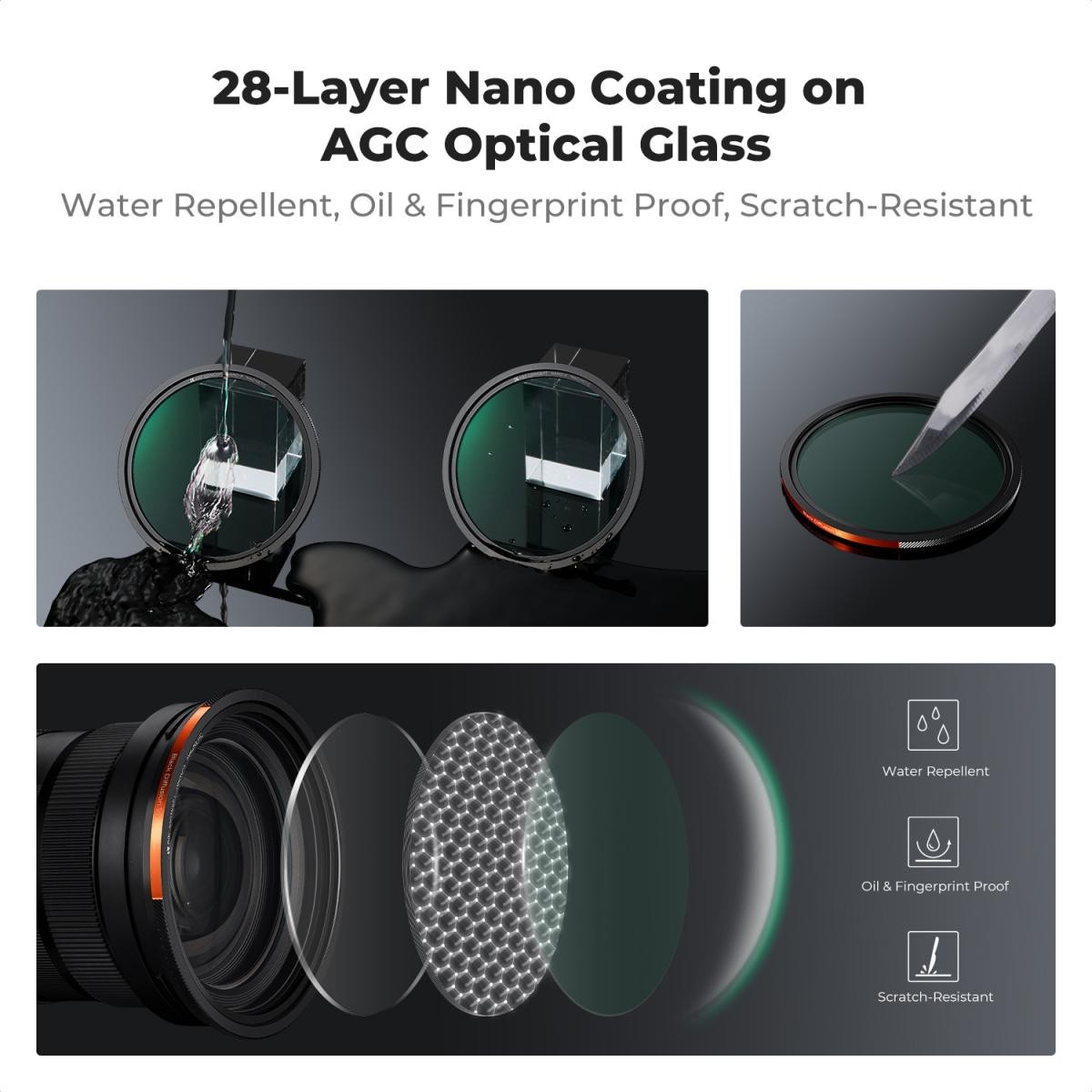 K&F CONCEPT 82mm Nano-X Series magnetski komplet filtera dizajniran je za kreativce koji zahtijevaju brzinu, pouzdanost i beskompromisne optičke performanse. Zahvaljujući magnetskom sustavu za brzu zamjenu, možete trenutno pričvrstiti ili zamijeniti filtere bez frustracija tradicionalnog navoja - idealno za brzo promjenjive uvjete osvjetljenja. Svaki filter ima napredni 28-slojni nano-premaz koji odbija vodu, ulje, prašinu i ogrebotine, a istovremeno čuva jasnoću i osigurava jednostavno čišćenje. CPL i ND filteri nude vjernost boja, uklanjajući žutu nijansu koja se često viđa kod filtera niže kvalitete i smanjujući potrebu za korekcijom boja u postprodukciji. ND3-32 filter ima precizne krajnje položaje i ultra glatku, tihu rotaciju, što ga čini posebno vrijednim za snimatelje koji se oslanjaju na čisto snimanje zvuka. Komplet zaokružuje atmosferski Black Mist 1/4 filter, savršen za omekšavanje istaknutih dijelova i poboljšanje filmskog raspoloženja vaše snimke. Uz zaštitnu prijenosnu torbicu i čičak traku, ovaj komplet oprema fotografe i filmaše svime što im je potrebno za kreativnu svestranost, izdržljivost i profesionalne rezultate.