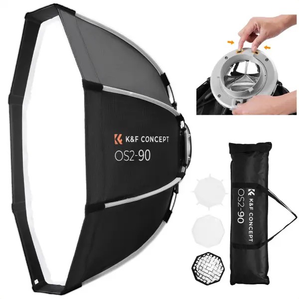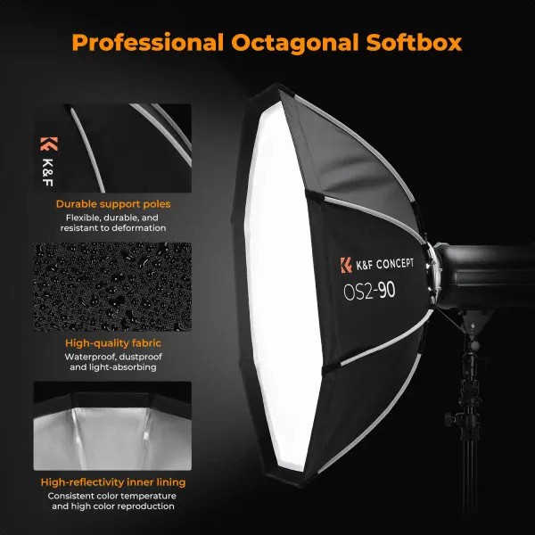 K&F CONCEPT 90cm ravni osmerokutnički softbox je brzopostavljajući modifikator svjetla s Bowens montažom dizajniran za stvaranje mekog, ravnomjernog osvjetljenja s prirodnim okruglim odsjajima, što ga čini idealnim za portrete, modu, intervjue i snimanja na lokaciji.