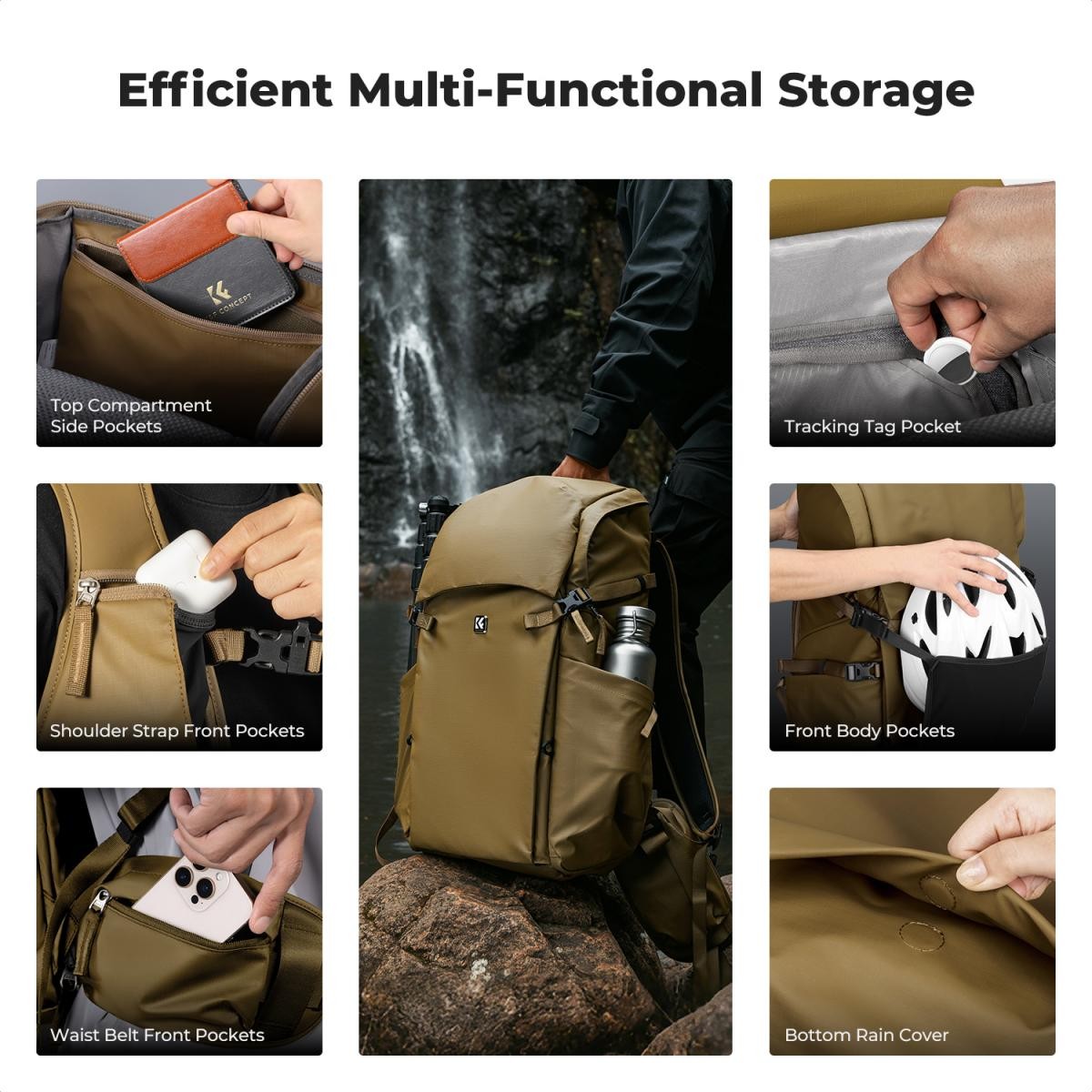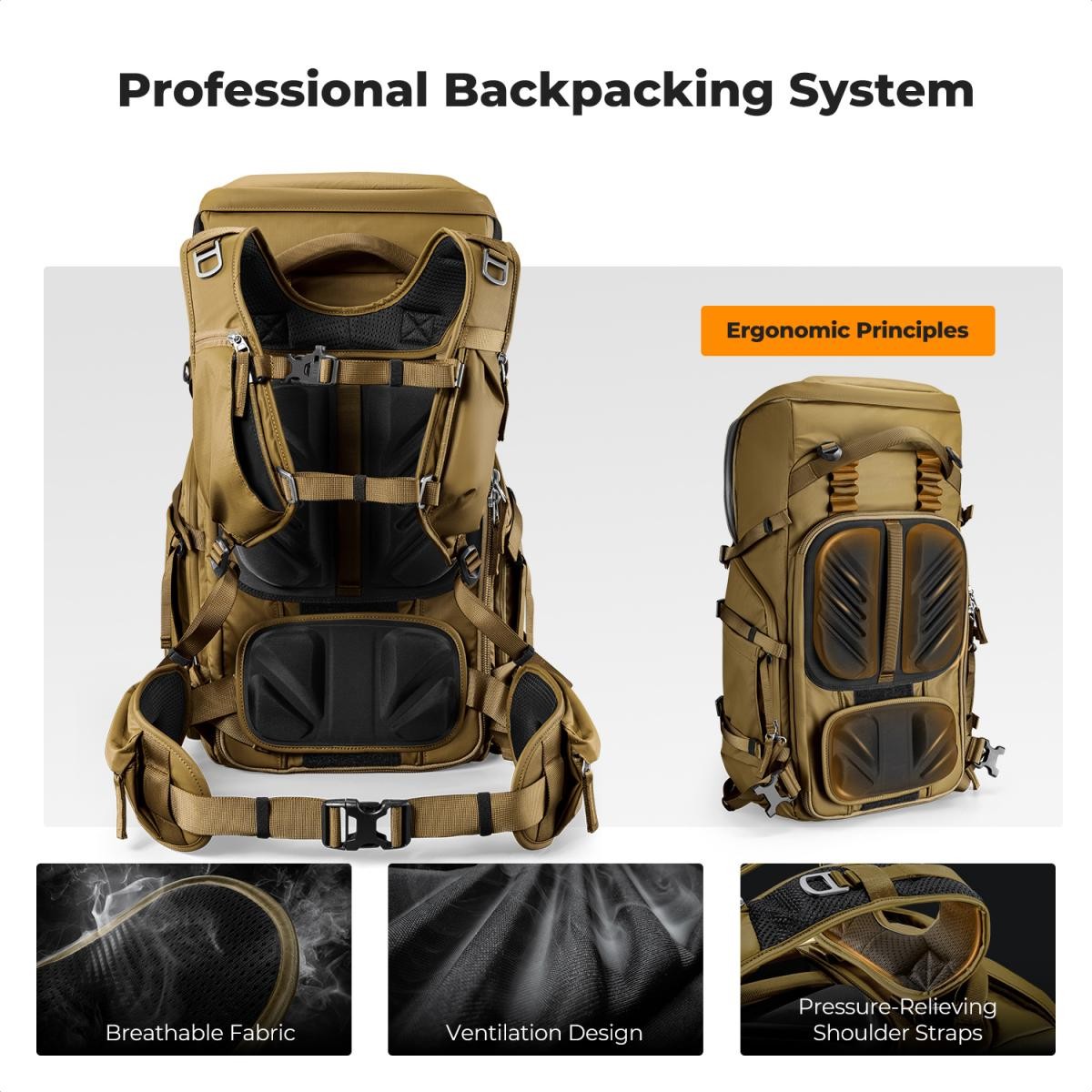 Ruksak K&F CONCEPT Star Wander05 40L dizajniran je kako bi zadovoljio zahtjeve ozbiljnih fotografa na otvorenom, kreatora krajolika i ljubitelja planinarenja. Izrađen prema standardima profesionalnih ruksaka za planinarenje, ima trostruko podesivi sustav pojaseva koji omogućuje precizno podešavanje visine ramena, prsnog remena i pojasa za struk kako bi odgovarao širokom rasponu tipova tijela. Ovaj ergonomski dizajn ravnomjerno raspoređuje teška opterećenja, smanjujući umor tijekom dugih planinarenja i misija s velikim opterećenjem.