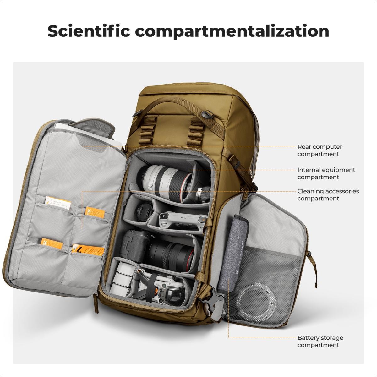 K&F CONCEPT ruksak 40L Star Wander05 (šampanjac) je profesionalni ruksak za fotografiranje i planinarenje na otvorenom, dizajniran za udobnost, zaštitu i brz pristup. S ergonomskim trostruko podesivim sustavom pojaseva, materijalima otpornim na vremenske uvjete i modularnim uklonjivim uloškom za kameru, ovaj ruksak idealan je za fotografe i avanturiste koji nose tešku opremu na velike udaljenosti.