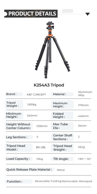 K&F Concept Ball Head Quick Release Plate DSLR stativ Aluminijski stativ za digitalne SLR fotoaparate