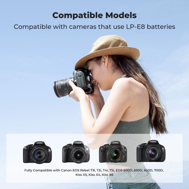 K&F Concept Canon LP-E8 baterijski komplet sadrži 3 LP-E8 baterije visokog kapaciteta 1200 mAh, 7,4 V , koje pružaju pouzdano i dugotrajno napajanje za neprekidno snimanje s Canon fotoaparatima. Kompatibilan je s Canon EOS Rebel T2i, T3i, T4i, T5i, 550D, 600D, 650D, 700D, Kiss X4, X5, X6 i drugim modelima s LP-E8 baterijom.