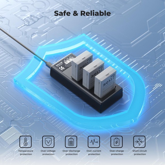 Komplet sadrži LCD punjač baterija s 3 utora , što omogućuje istovremeno punjenje tri baterije uz prikaz statusa punjenja svake na jasnom LCD zaslonu. Punjač podržava dvostruki ulaz putem Micro USB-a ili Type-C (5V/2.1A), što ga čini kompatibilnim sa zidnim adapterima, autopunjačima, prijenosnim računalima i drugim USB izvorima napajanja. Korištenjem Type-C ulaza, sve tri baterije mogu se potpuno napuniti za otprilike 3,8 sati .