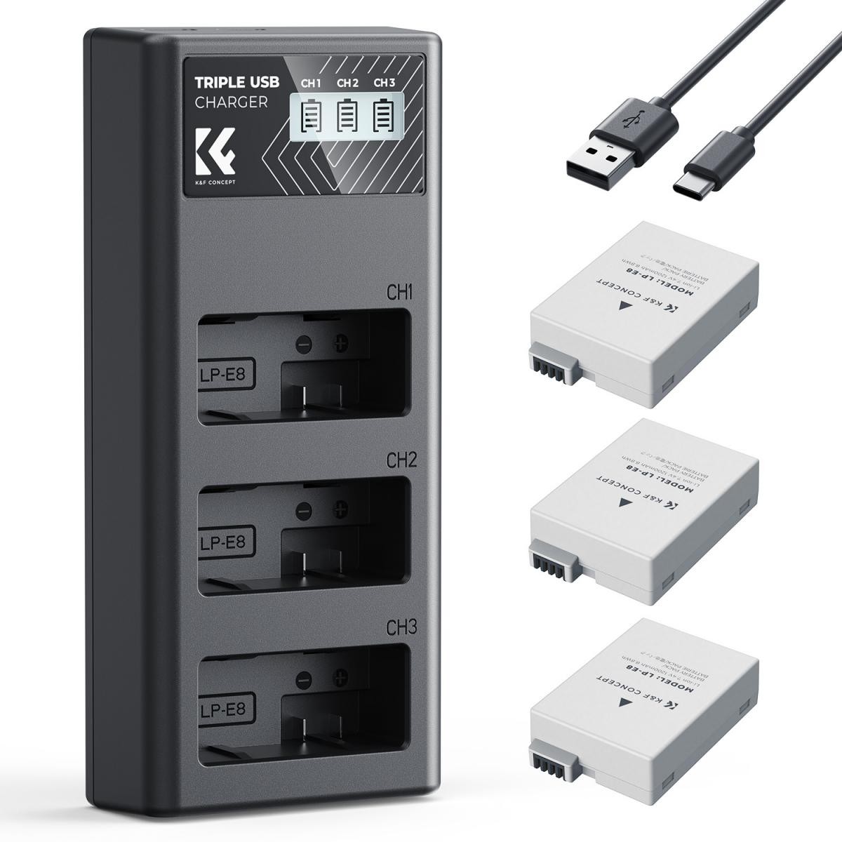 K&F Concept paket od 3 Canon LP-E8 baterije za fotoaparat s 3 LCD punjačem . Uključuje LP-E8 baterije od 1200 mAh i LCD punjač s dvostrukim Micro USB/Type-C ulazom za brzo i sigurno punjenje.