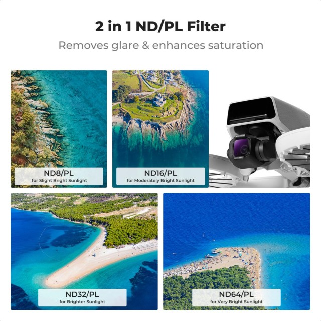 ND/PL set filtera za DJI Flip kameru drona, koji pomaže u regulaciji količine svjetla i poboljšava kontrast i boje slika. Set uključuje filtere: ND8/PL, ND16/PL, ND32/PL, ND64/PL.