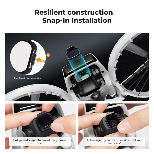 Filteri imaju sustav pričvršćivanja koji savršeno pristaje DJI Flip 4K UHD kameri. Jednostavno ih pričvrstite i odmah možete početi snimati iz zraka.