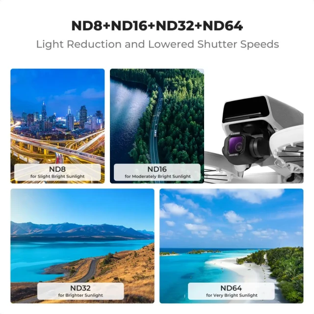 - * 【Smanjenje svjetla i uravnotežena ekspozicija】Filter ND8 ND16 ND32 ND64 smanjuje ekspoziciju za 3 na 6 stupnjeva, idealno za različite uvjete jakog sunčevog svjetla, a istovremeno prirodno poboljšava detalje slike. Blokira odgovarajuću vrijednost svjetla za akcijsku kameru tijekom dinamičnih aktivnosti na otvorenom kako bi prilagodio parametre kamere i postigao efekt zamućenja pokreta.