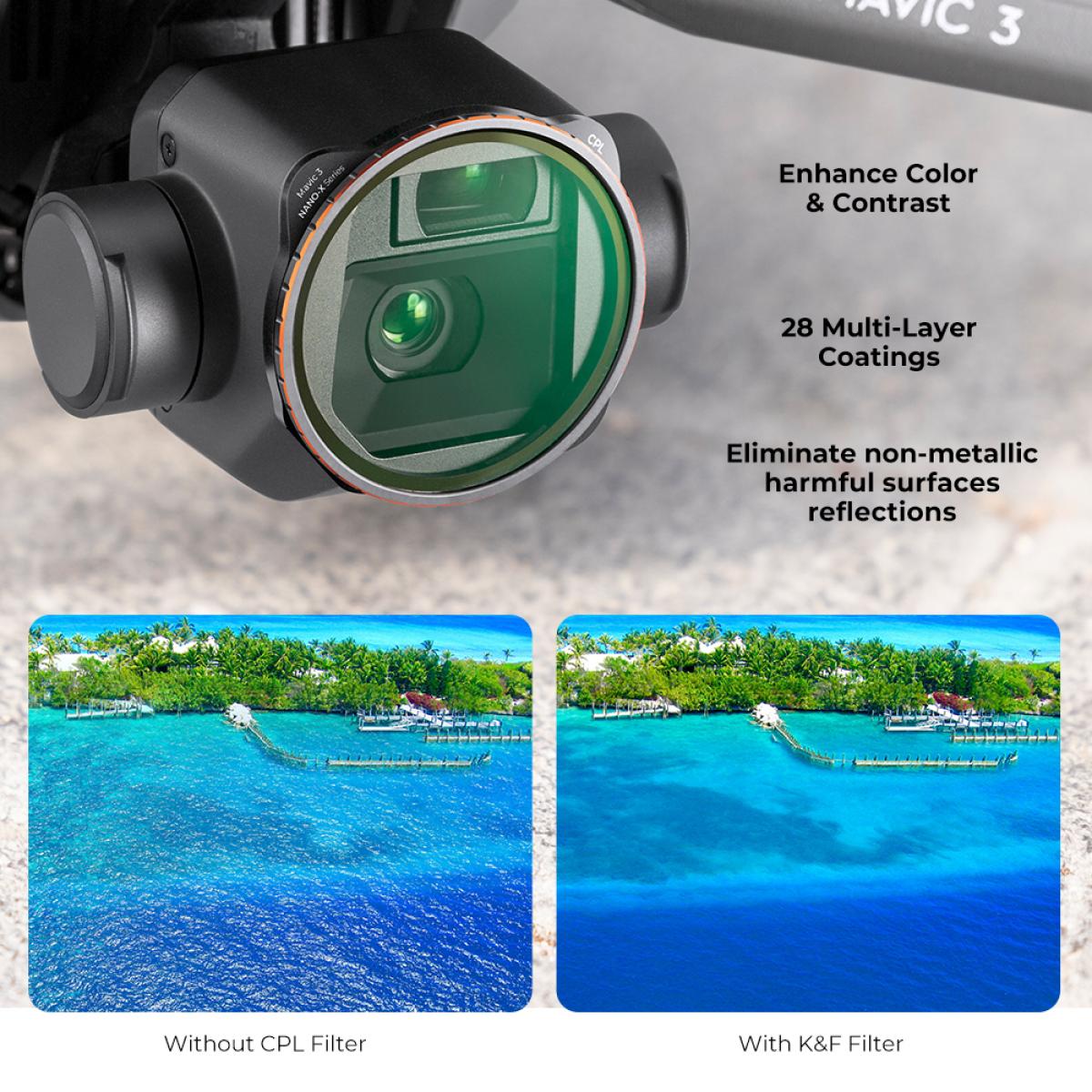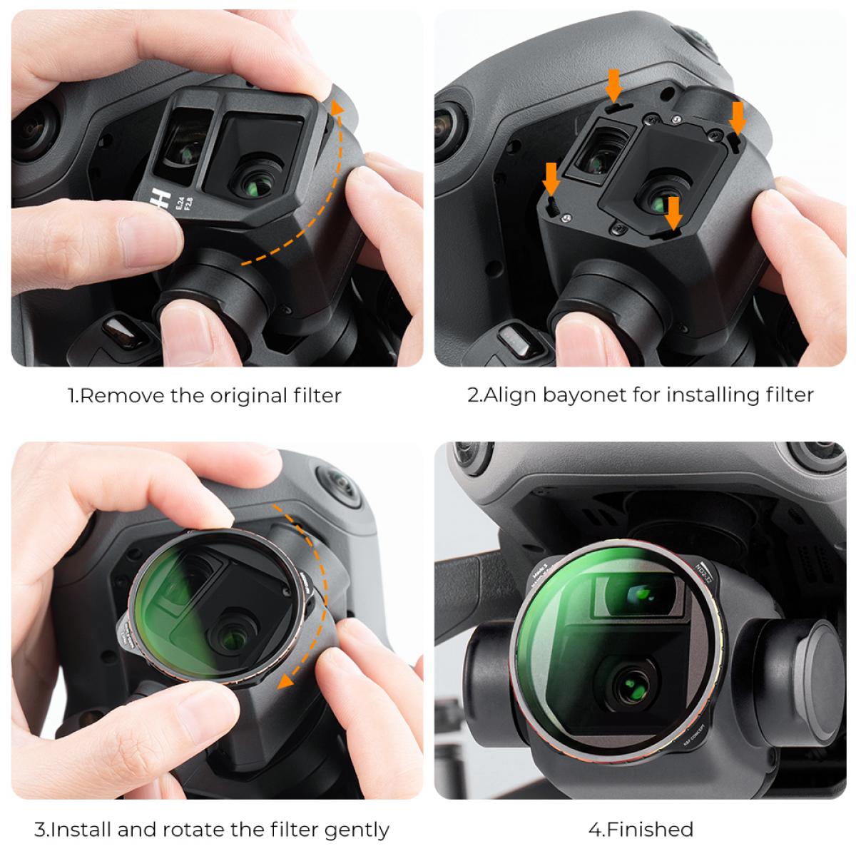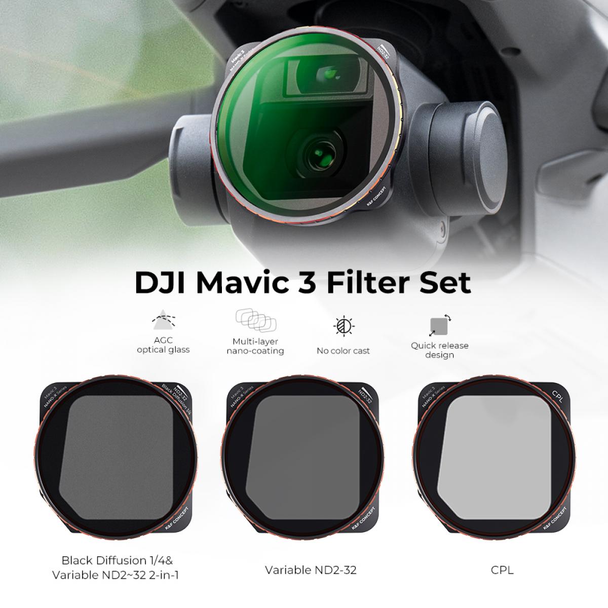- 1* ND2-ND32 varijabilni filter + 1* CPL filter + 1* ND2-ND32 i crni difuzni 1/4 višenamjenski filter 2 u 1. Prikladno za DJI Mavic 3/DJI Mavic 3 Cine.