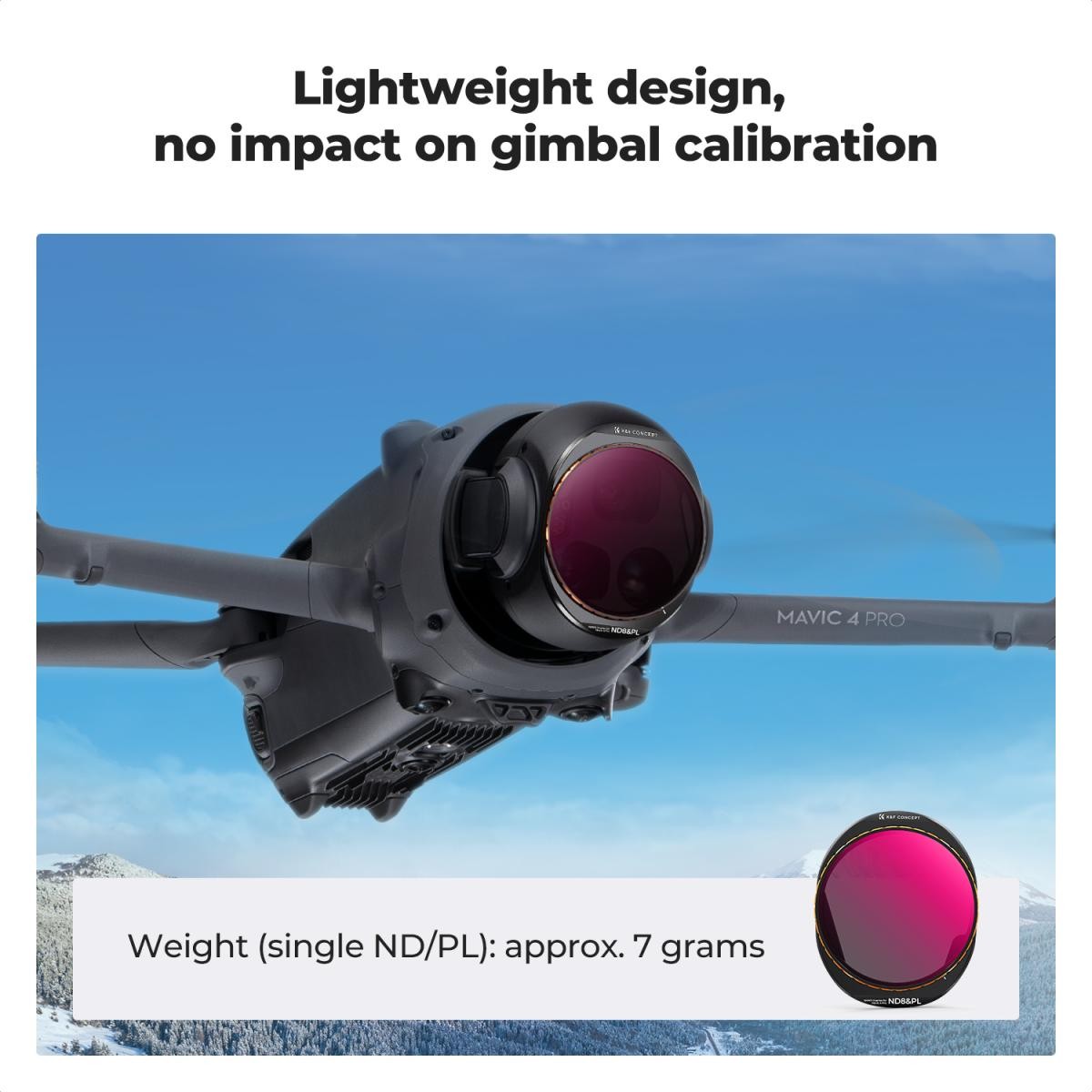 Ovaj ND CPL 2-u-1 komplet filtera posebno je izrađen za DJI Mavic 4 Pro, uključujući paket od 4 - ND8 i PL + ND16 i PL + ND32 i PL + ND64 i PL. Jednostavan za ugradnju, isti način ugradnje kao i originalna DJI zaštitna leća. Izrađen od uvoznog AGC optičkog stakla s višeslojnim premazom, smanjuje odsjaj i refleksiju leće te osigurava vraćanje stvarne boje slike.
