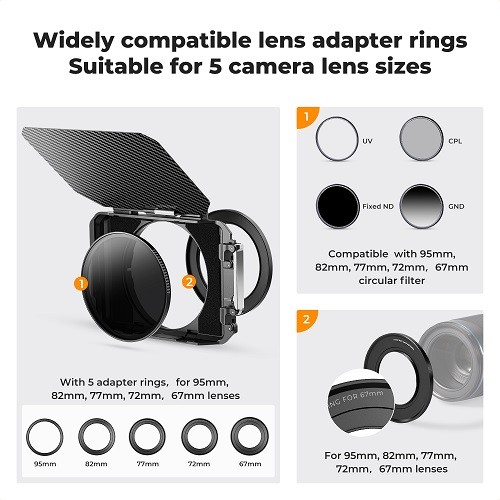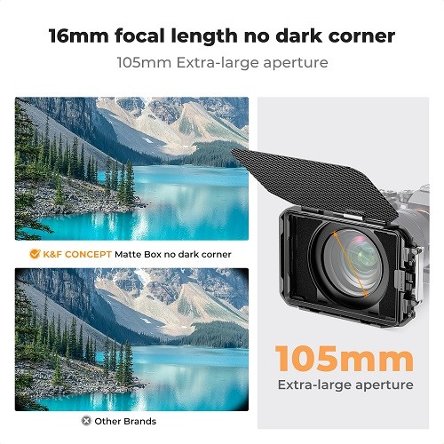 K&F Concept SKU.2364V1 Matte Box Kit je vrhunski filmski pribor dizajniran da snimateljima i snimateljima pruži potpunu kontrolu nad odbljeskom objektiva, prosipanjem svjetla i korištenjem filtera. Dizajniran za svestranost, ovaj mat box kompatibilan je s dva industrijska standardna kvadratna filtera veličine 4×5,65″ , što vam omogućuje jednostavno stvaranje zapanjujućih vizualnih efekata. Izrađen od laganih, ali izdržljivih karbonskih vlakana i aluminija zrakoplovne kvalitete , ovaj mat box je napravljen za zahtjevna snimanja, a istovremeno ostaje prenosiv i jednostavan za montažu. Komplet uključuje više adapterskih prstenova , što osigurava besprijekornu kompatibilnost s različitim veličinama objektiva.