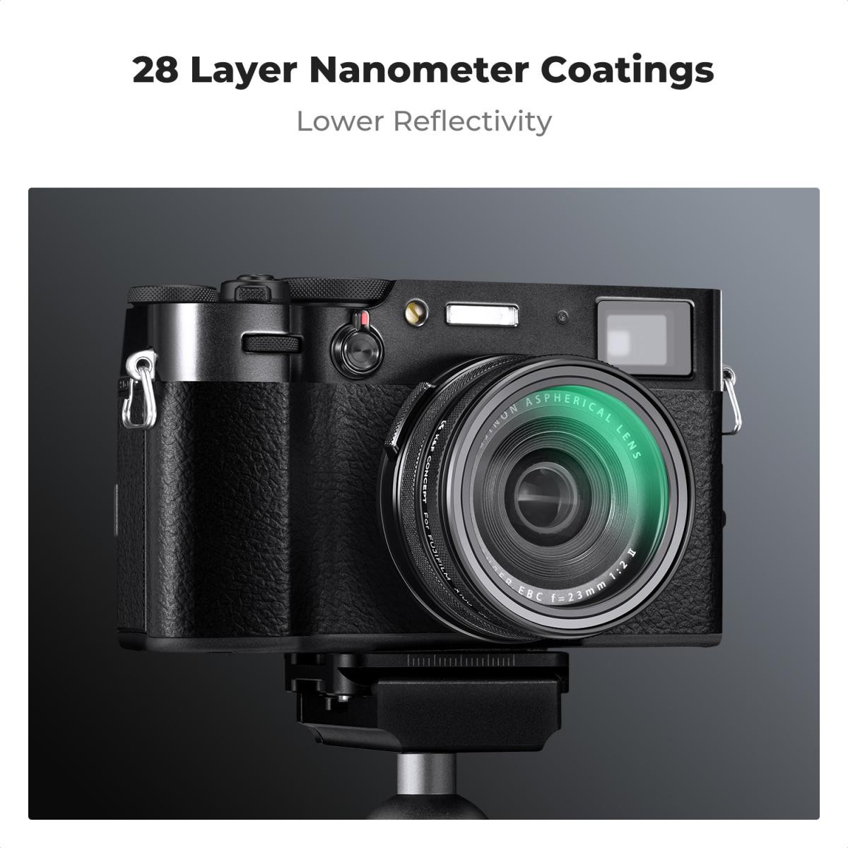 Optičko staklo visoke razlučivosti osigurava maksimalnu propusnost svjetla uz očuvanje oštrine i točnosti boja . Nano premaz otporan na ogrebotine, vodootporan i otporan na ulje dodaje izdržljivost, održavajući vaš objektiv čistim i jasnim u različitim uvjetima snimanja. Crni aluminijski okvir dizajniran je za besprijekorno pristajanje uz Fujifilm X100, X100V, FX100, SX100, TX100 i druge kompatibilne modele.