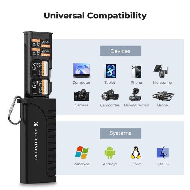 K&F CONCEPT kutija za memorijske kartice velike brzine kompaktno je, zaštitno rješenje za pohranu dizajnirano za sigurno držanje SD kartica, micro SD (TF) kartica i Nano SIM kartica. Zahvaljujući izdržljivoj konstrukciji i univerzalnoj kompatibilnosti, vaše bitne memorijske kartice drži organiziranima i lako dostupnima, a istovremeno nudi praktične mogućnosti povezivanja putem USB-C i USB-A priključaka.