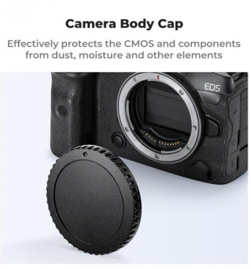 K&F Concept Canon EF zaštitni komplet za bajonet uključuje 2 poklopca za tijelo, 2 stražnja poklopca za objektiv, 2 poklopca za priključak blic-shoe-a i 1 krpu za čišćenje od mikrovlakana za Canon EF fotoaparate (T7, T6, T5, T8i, T7i, 5D IV/III/II, 6D II/I, 90D, 80D). Izrađen od izdržljivog ABS-a s čvrstim bajonetnim prianjanjem i crnom završnom obradom, štiti senzore, objektive i kontakte od prašine, vlage i ogrebotina - savršeno za pohranu i putovanja.