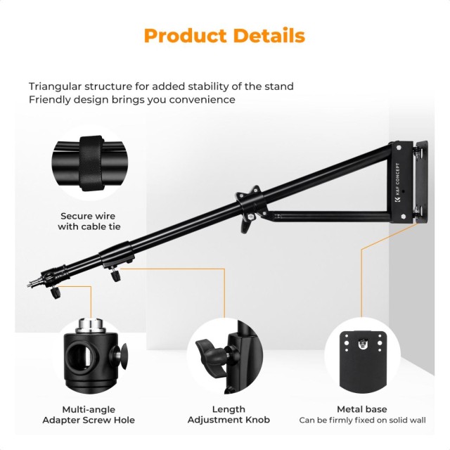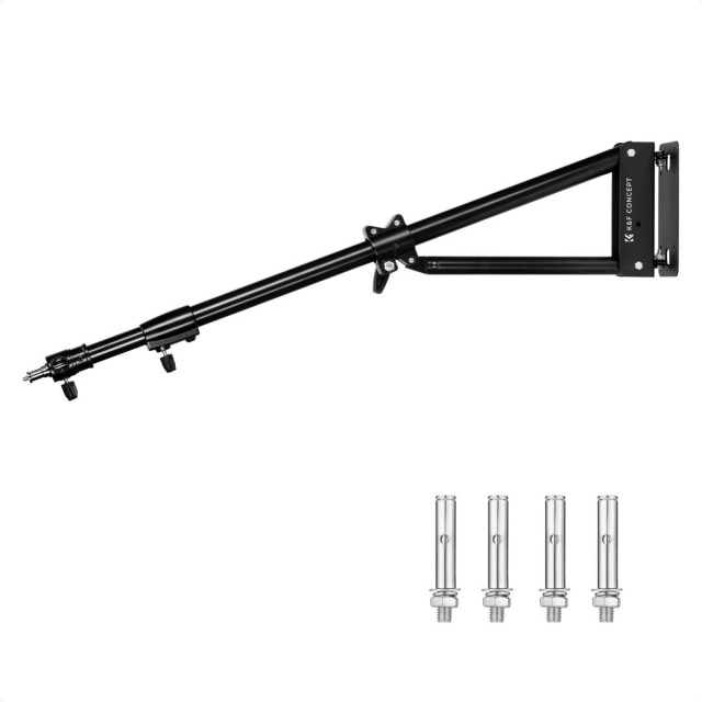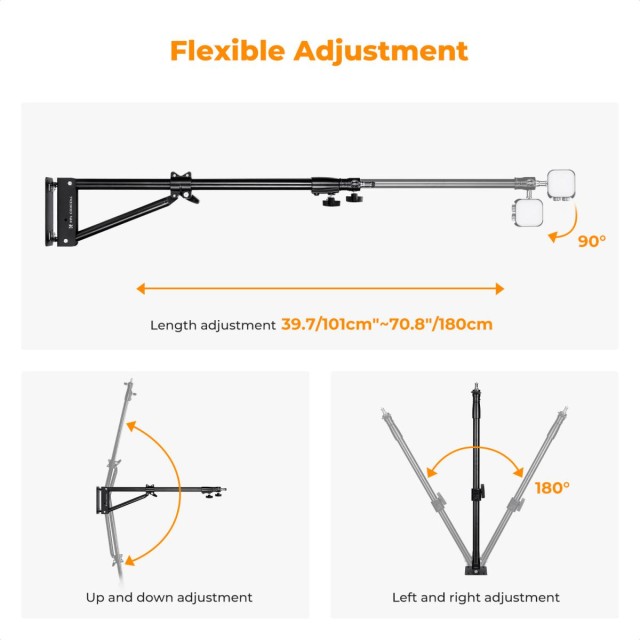 Sigurno se montira na zid i sklapa na kompaktnih 93,5 cm (36,8") kada se ne koristi, oslobađajući dragocjeni prostor na podu i održavajući organizaciju vašeg studija. Ruka za snimanje ima vertikalni zamah od 180° i horizontalnu rotaciju od 180°, što omogućuje svestrano podešavanje kuta. Kada se ne koristi, može se sklopiti ravno uz zid radi uštede prostora. Idealan je za montažu fotografskih svjetala, nadzornih uređaja ili monitora, a zadovoljava složene potrebe pozicioniranja poput naginjanja, panoramiranja i izvlačenja.