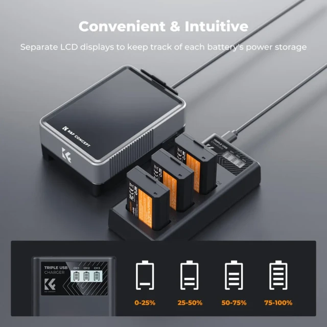 K&F Concept LP-E10 baterija u paketu od 3 i nadograđeni LCD punjač. Punjač s tri utora može učinkovito istovremeno puniti 3 LP-E10 baterije, a LCD zaslon jasno prikazuje status punjenja svake baterije.