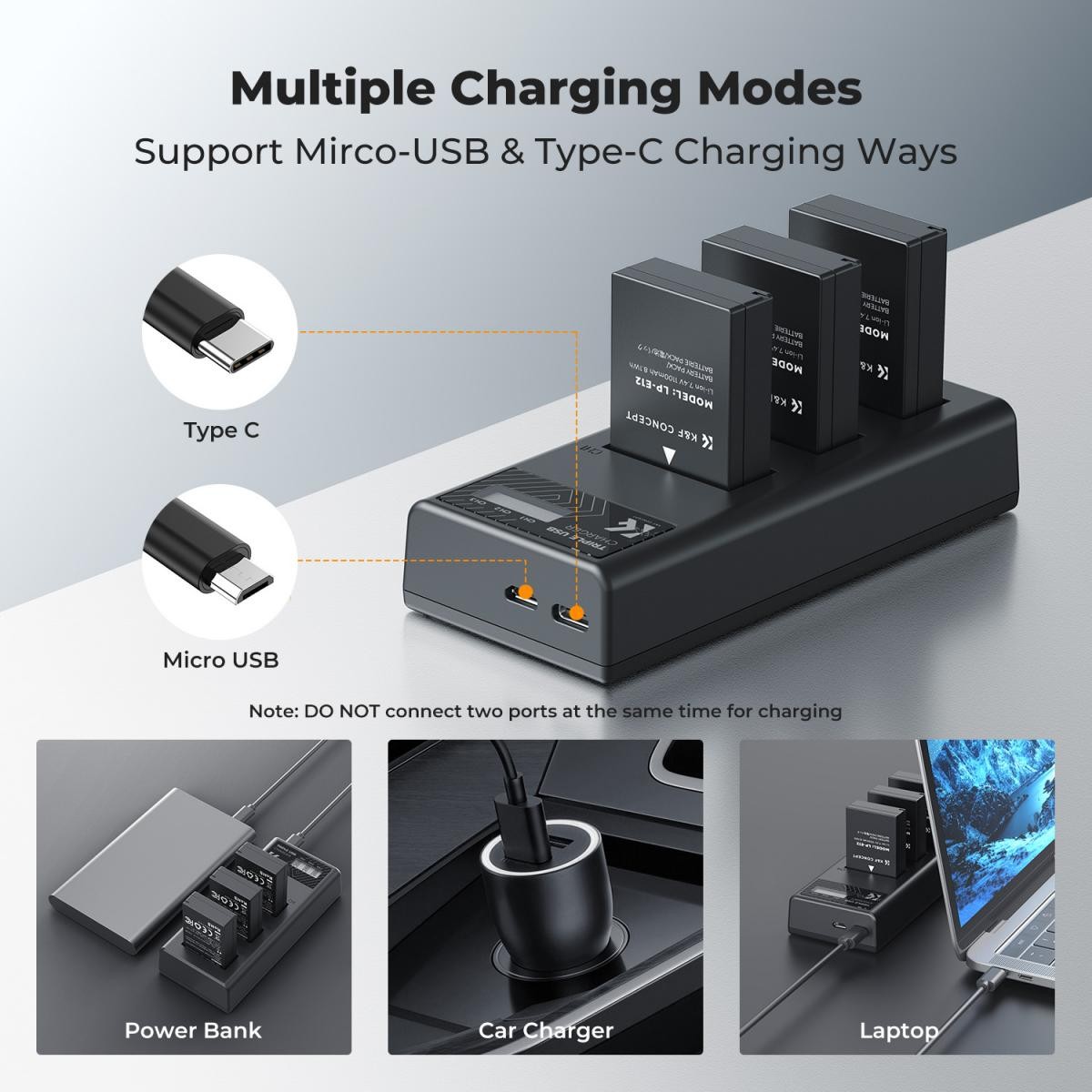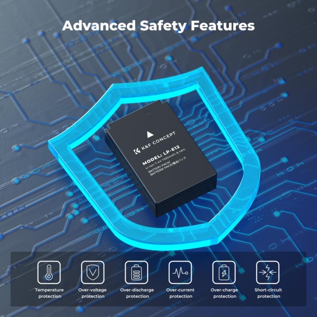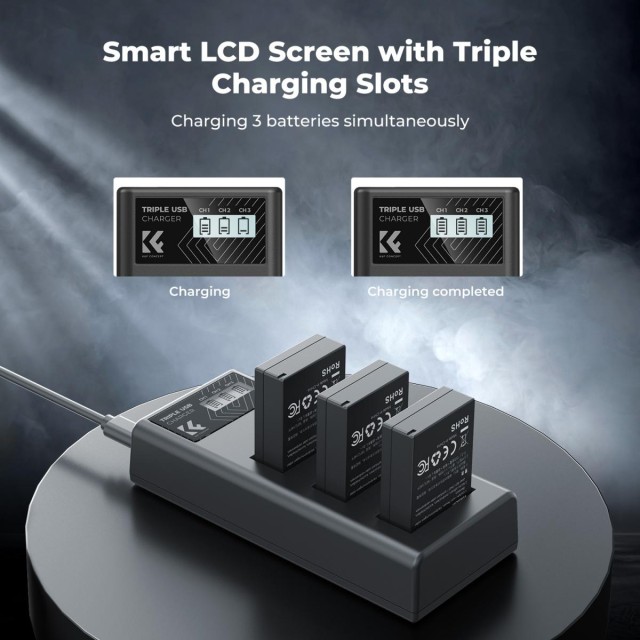 Set punjača baterija LP-E12 uključuje 3 baterije za EOS M50 (nazivnog kapaciteta 1100 mAh, 7,4 V, 8,8 Wh) i LCD punjač s tri utora, što osigurava kontinuirano napajanje za dulje snimanje. Punjač s tri utora može učinkovito istovremeno puniti 3 baterije za EOS M50, a LCD zaslon jasno prikazuje status punjenja svake baterije.