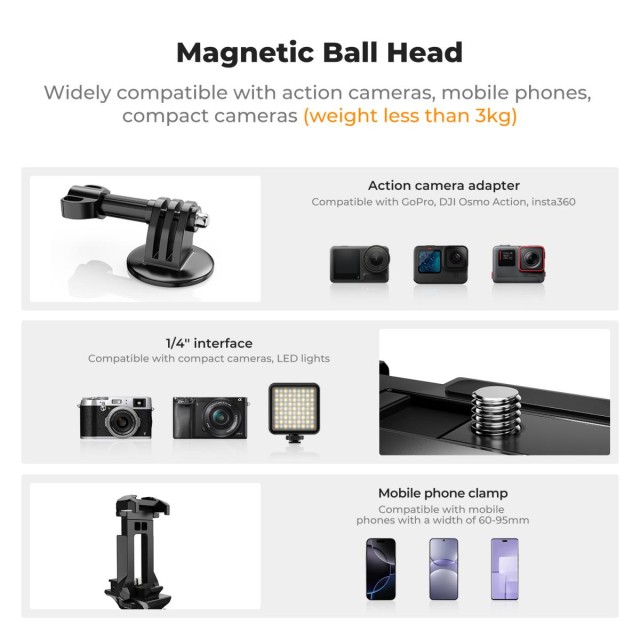 2-u-1 višenamjenski autonomni dizajn s tri oblika sučelja. Jednodijelni dizajn skrivene kopče za mobitel, rasklapa se kao univerzalna kopča za mobitel, može se izravno montirati na kameru nakon pohrane. Zadovoljava potrebe laganih mikro-svjetiljki, džepnih svjetiljki i drugih uređaja.