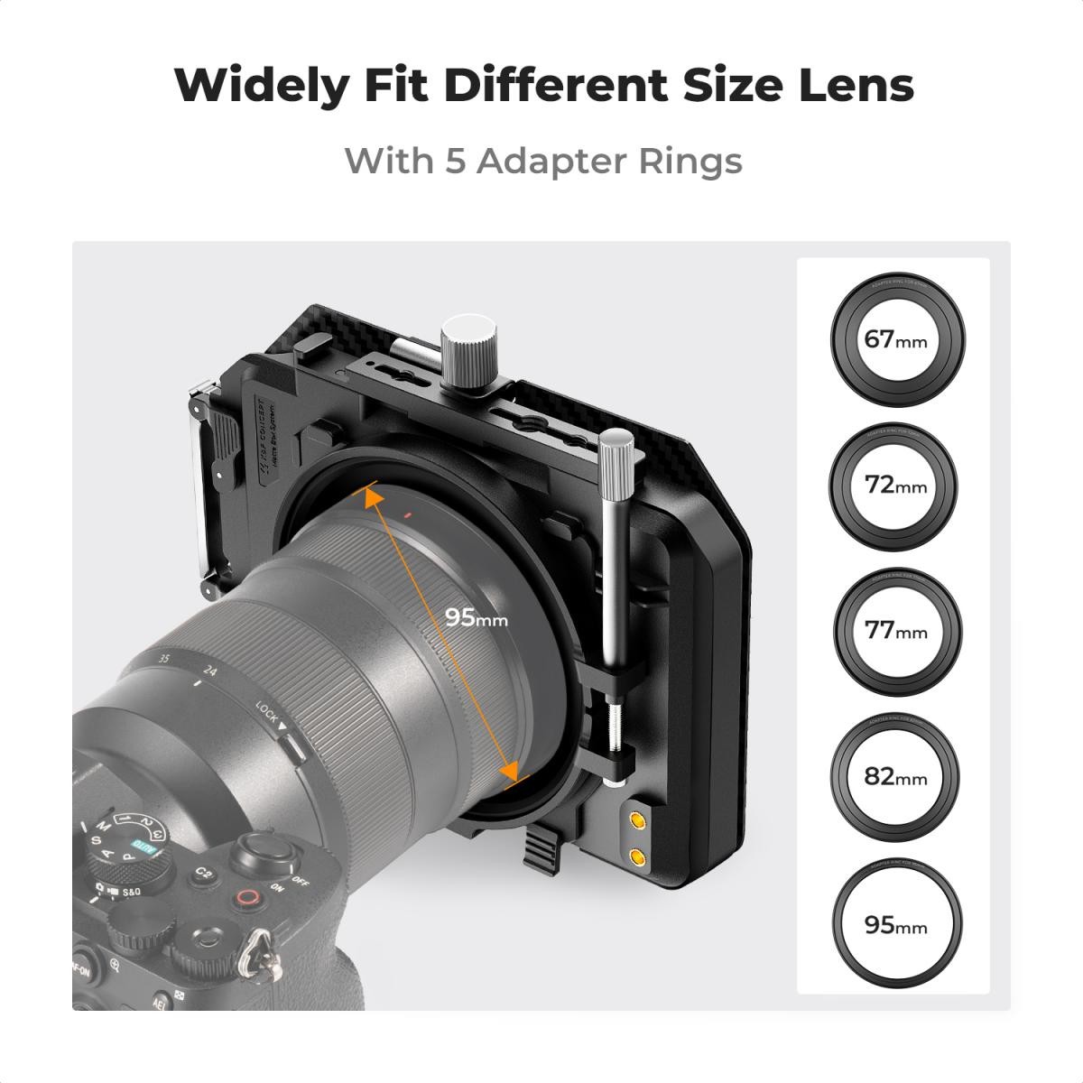 - * 【Potpuna kompatibilnost】Opremljen s 5 adapterskih prstenova (67/72/77/82/95 mm) koji odgovaraju većini DSLR i objektiva bez zrcala. Također uključuje više priključaka za proširenje (1/4", 3/8", hladni papuč) za ugradnju dodatne opreme i dodatno obogaćivanje iskustva snimanja.