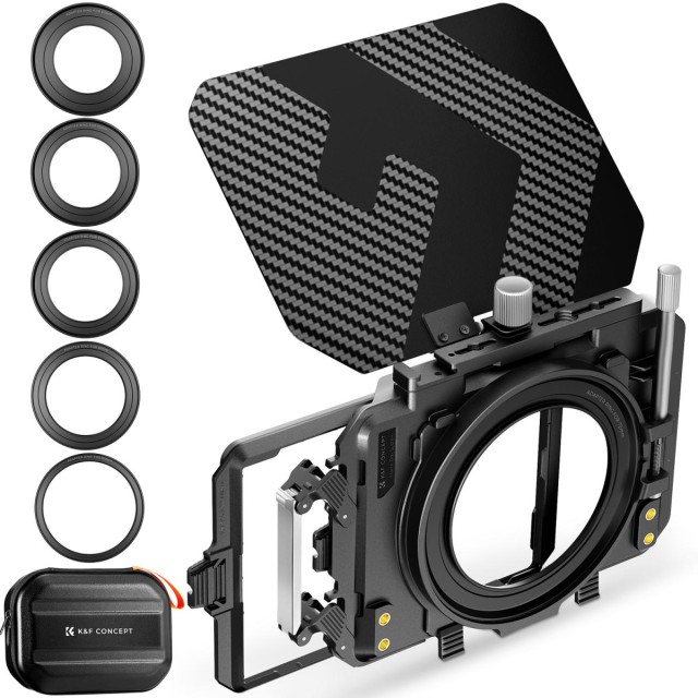 K&F Concept Matte Box komplet: Lagana kutija za mat objektive od karbonskih vlakana s 5 adapter prstenova (67/72/77/82/95 mm) + 2 ladice za filtere za 4x5,65" filtera - protiv rasipanja svjetla, bez vinjete za 16 mm objektive, proširiva s portovima i torbom za pohranu.