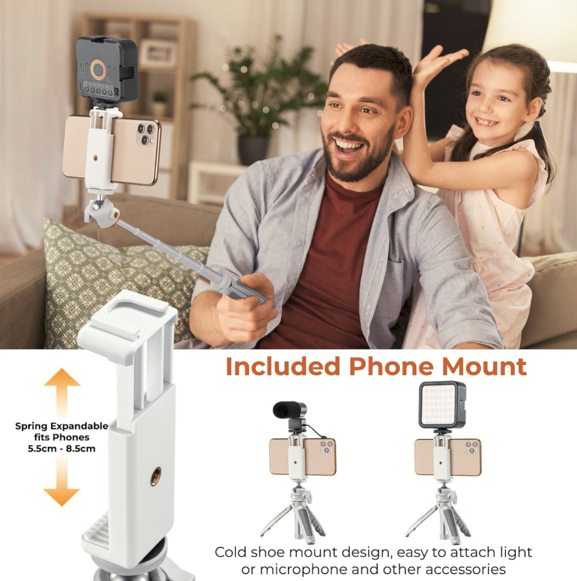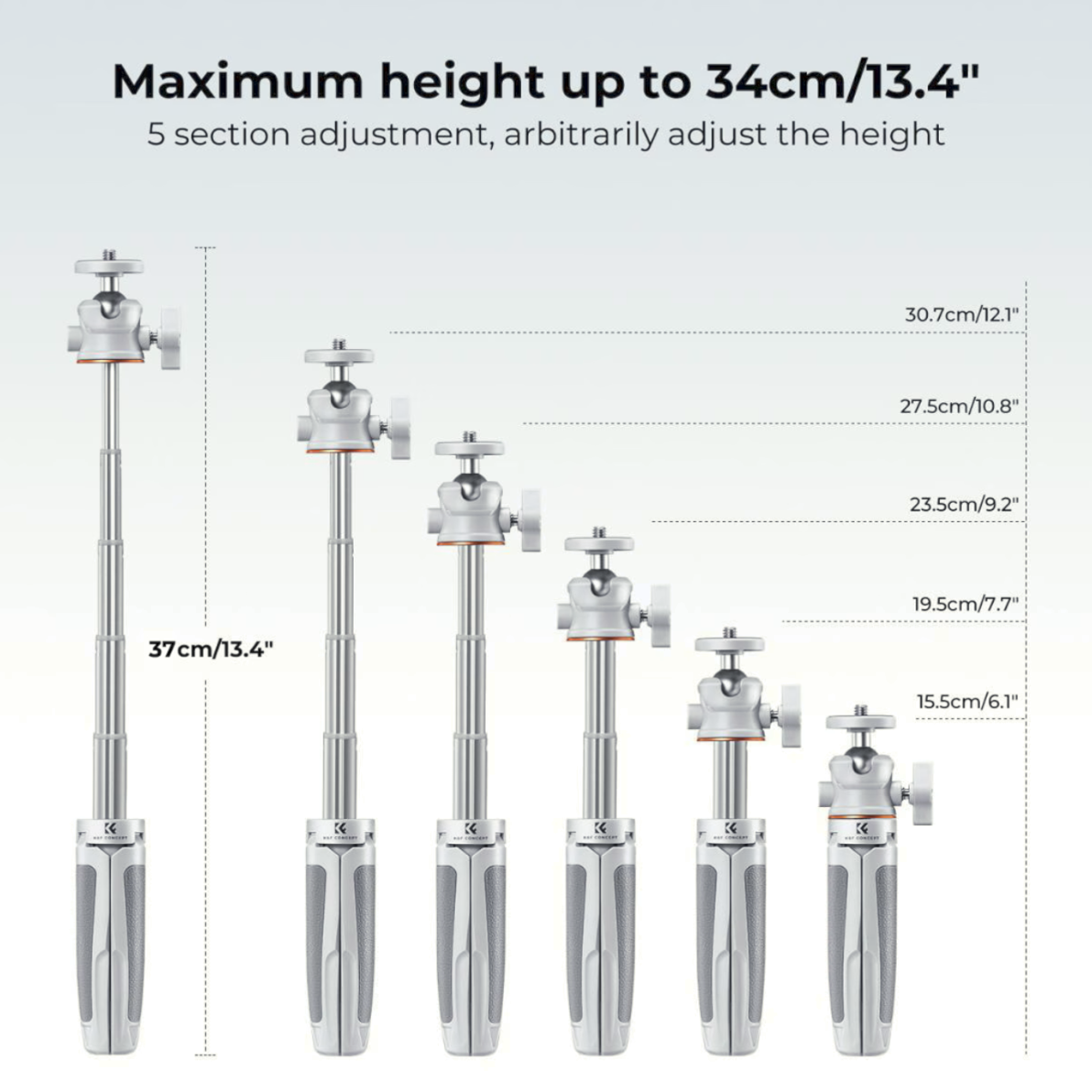 Produžni vrat nudi podešavanje visine od 13 cm do 34 cm, pružajući veću kreativnu fleksibilnost za sve, od snimanja sa stola do selfija iz povišenih kutova. Njegov visokokvalitetni kuglasti zglob od 360° s vertikalnim nagibom od 90° osigurava glatko i precizno podešavanje kuta, što olakšava prebacivanje između horizontalnog i vertikalnog načina snimanja sadržaja na društvenim mrežama.