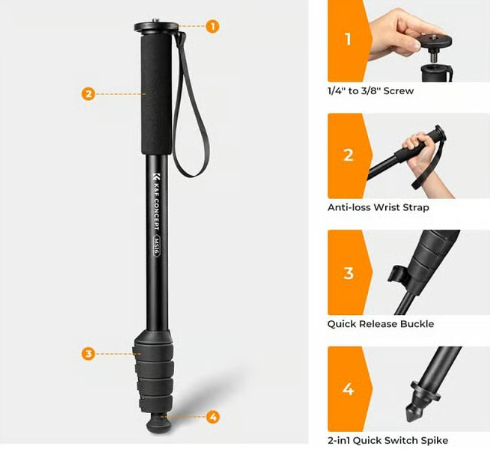 K&F Concept MS16 KF09.138V1 Monopod stativ za kameru je ultra lagani nosač od aluminijske legure s pet nogu dizajniran za fotografe u pokretu, koji nudi iznimnu stabilnost s nosivošću od 10 kg i podesivom visinom do 160 cm, kompaktno se sklapa na 43 cm za jednostavnu prenosivost. S panoramskom rotacijom od 360° i mehanizmima brzog zaključavanja za sigurna, intuitivna podešavanja, ovaj svestrani monopod izvrstan je u dinamičnim scenarijima snimanja poput događaja, divljih životinja ili putovanja, pružajući iznimno čvrste performanse bez gomile tradicionalnih stativa.