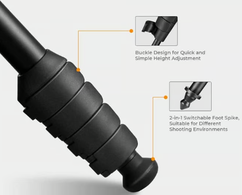 Ono što izdvaja MS16 je njegov inovativni dizajn s pet nogu, koji pruža stabilnost sličnu stativu s jedne šipke širenjem u podnožju za poboljšanu ravnotežu na neravnom terenu, dok panoramska glava od 360° omogućuje fluidno, kružno pomicanje za praćenje akcije ili precizno komponiranje krajolika. Sustav zaključavanja s jednostavnim upotrebom osigurava munjevito brzo podešavanje nogu i sigurno uporište, zaključavajući se na mjestu zadovoljavajućim klikom kako bi se spriječilo klizanje u kritičnim trenucima. Izgrađen da izdrži zahtjeve profesionalne upotrebe, ovaj monopod kombinira materijale zrakoplovne kvalitete s promišljenom ergonomijom, osnažujući kreatore da snimaju oštre, stabilne snimke u pokretu bez žrtvovanja brzine ili praktičnosti - zaista vrhunska mješavina prenosivosti i snage u jednom elegantnom pakiranju.