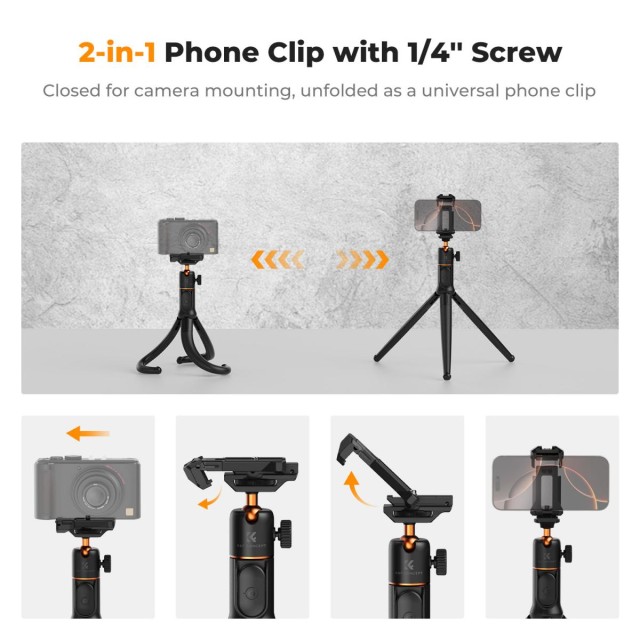 K&F Concept MS29 Extendable Fleksibilni stativ nudi svestranu, stabilnu i prenosivu podršku za pametne telefone, kamere i akcijske kamere . Sa savitljivim nogama, rotacijom kuglaste glave od 360° i dizajnom 3 u 1 , osigurava maksimalnu fleksibilnost za snimanje zadivljujućih snimaka na bilo kojoj površini.