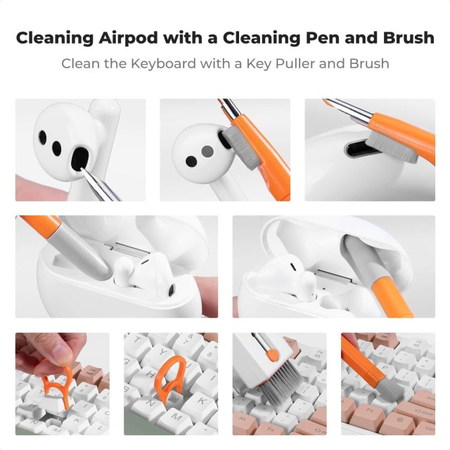 Komplet uključuje 11 osnovnih alata za čišćenje, svaki prilagođen za određeni zadatak. Teleskopska četka i duga četka učinkovito uklanjaju prašinu s velikih površina poput tipkovnica i prijenosnih računala, dok alat za izvlačenje tipki omogućuje jednostavno uklanjanje tipki za dubinsko unutarnje čišćenje. Za detaljan rad, memorijske spužve, četka visoke gustoće i vrh olovke za čišćenje savršeni su za čišćenje kućišta slušalica, otvora za zvuk, priključaka i uskih kutova.