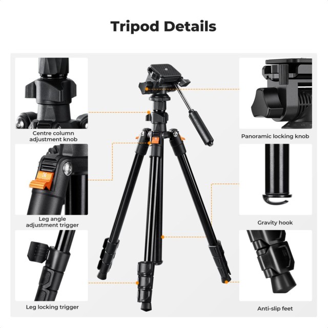 Stativ kombinira funkcionalnost i prenosivost, s dizajnom nogu s 4 dijela, njegova maksimalna visina može doseći 196 cm. Nakon rastavljanja glave, stativ se može sklopiti unatrag, a sklopiva veličina je samo 43 cm, tako da se lako može pohraniti u ruksak ili torbu za kameru.