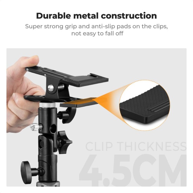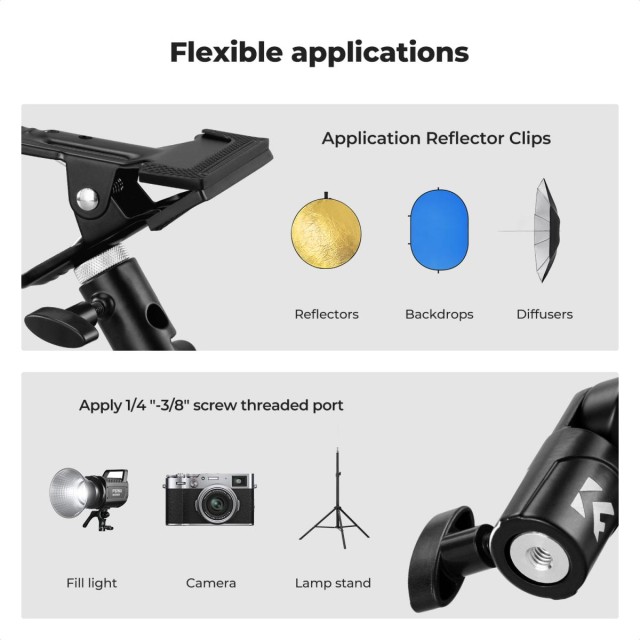 K&F CONCEPT nosač reflektora za teške uvjete rada ima snažnu metalnu kopču, protuklizne obloge i univerzalnu bazu od 5/8", što fotografima omogućuje sigurno postavljanje reflektora ili kišobrana bez asistenta za stabilnu i praktičnu kontrolu rasvjete.
