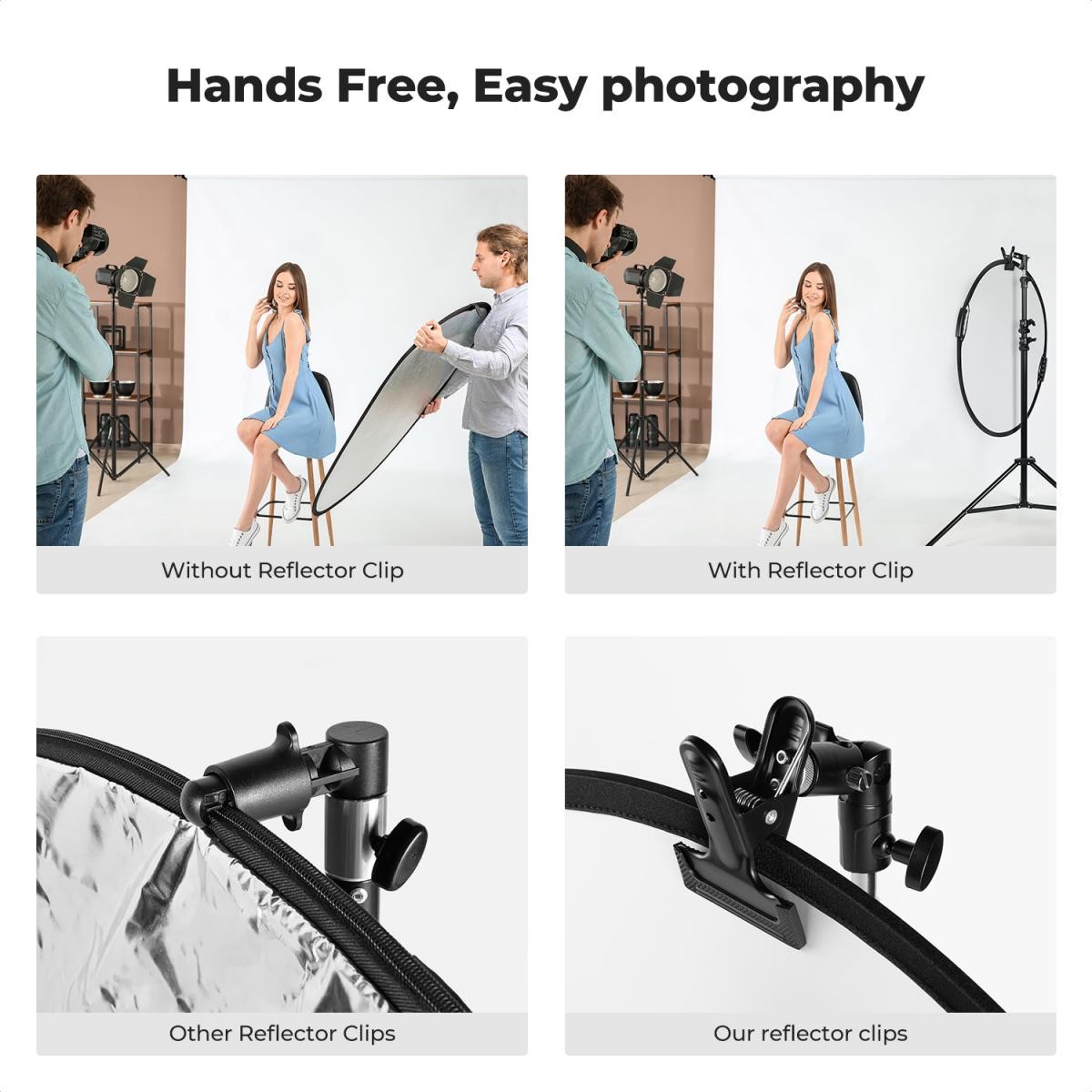 Nosač reflektora za fotografiju K&F CONCEPT je izdržljiva metalna kopča dizajnirana za sigurno držanje reflektora tijekom snimanja u studiju ili na otvorenom bez potrebe za asistentom. Njegova metalna opruga visoke čvrstoće pruža snažnu steznu silu, dok protuklizna podloga osigurava stabilnost i sprječava slučajno klizanje. Dizajniran za svestranost, nosač uključuje središnji otvor za vijak za zaključavanje, što fotografima omogućuje jednostavno montiranje i pričvršćivanje suncobrana s mekim svjetlom. Univerzalna baza od 5/8", uparena s priloženim adapterom za vijak od 1/4" do 3/8", osigurava kompatibilnost sa svim standardnim stalkom za svjetlo. Jednostavan za postavljanje i izrađen za pouzdane performanse, ovaj nosač je neophodan alat za fotografe kojima je potreban učinkovit i stabilan nosač reflektora ili suncobrana.